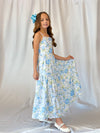 Vestido largo de tiras estampado, escore recto con detalle de bolero en el rededor del escote, espalda encauchada para mayory ajuste y tiras para anudar y hacer corbata, falda larga con cortes y forro por dentro.